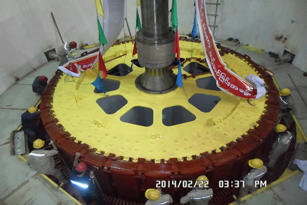 我公司承建的緬甸邦朗二期水電站(上邦朗水電站項目)于2014年2月22日凌晨順利將2#機轉子吊裝就位,緬甸電力部各級領導和中方項目部全體人員共同見證了這一刻。在有力的技術及后勤保障的支持下,業(yè)主單位也對我司該項目的設計、供貨及機電安裝工作給予了高度肯定。