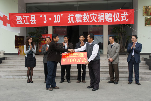 3月10日12時(shí)58分,云南省盈江縣發(fā)生5.8級(jí)地震。25人遇難,314人受傷,10余萬(wàn)間房屋頃刻間倒塌損壞。 為幫助災(zāi)區(qū)人民重建家園盡我們的一份綿薄之力,3月19日,馮總代表我公司向云南省德宏州盈江縣災(zāi)區(qū)捐款100萬(wàn)人民幣。將我們的愛心傳遞,為災(zāi)區(qū)人民祈福,希望災(zāi)區(qū)人民克服一切困難,早日重建美好家園!