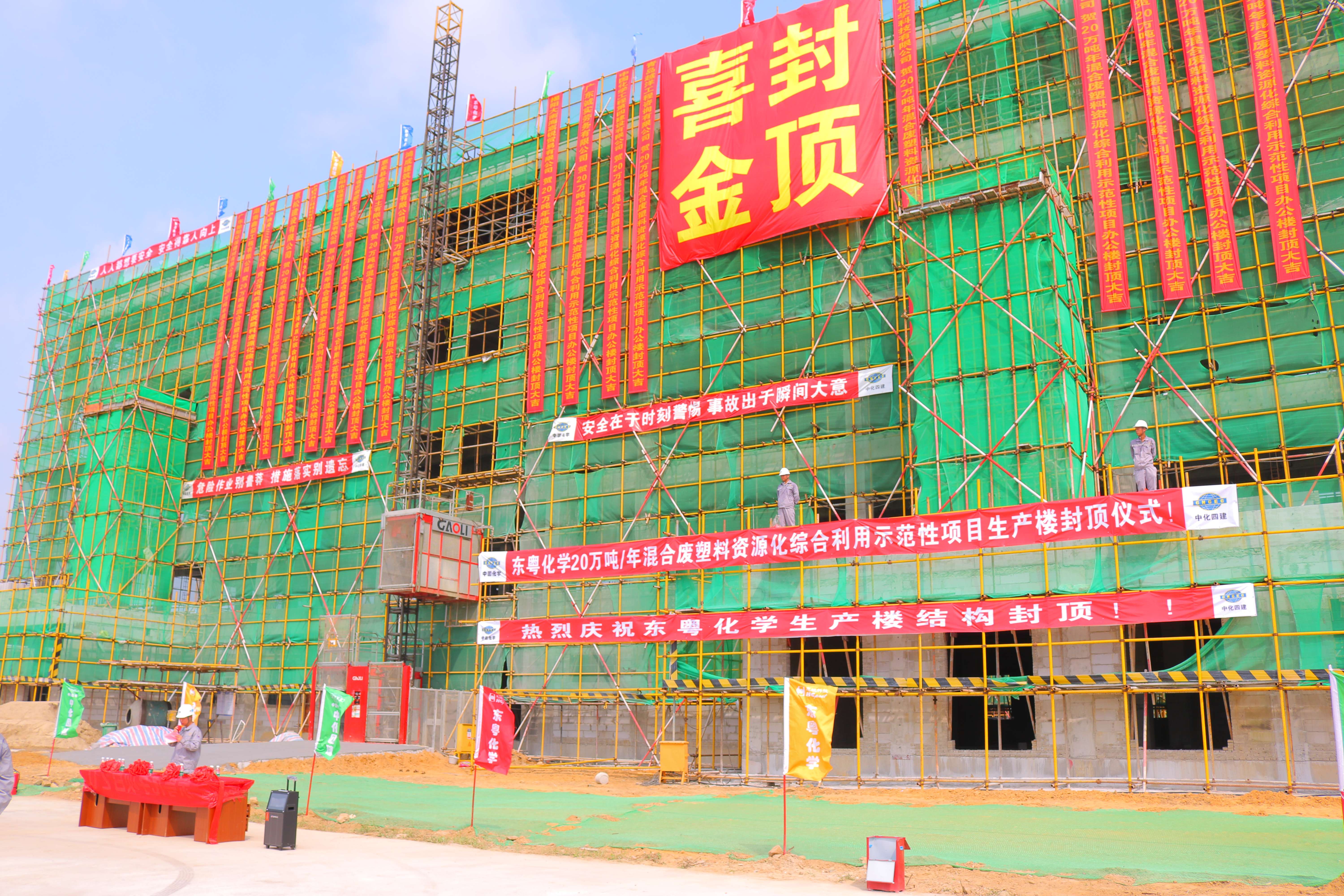 時風澍雨釀花天,吉日良辰喜報連。8月8日,隨著最后一段頂板混凝土完成澆筑,20萬噸/年混合廢塑料資源化綜合利用示范性項目辦公樓結構喜封金頂,標志著項目階段性節(jié)點順利完成,為年底建成投產(chǎn)奠定了堅實基礎。惠城環(huán)保集團子公司廣東東粵化學科技有限公司總經(jīng)理李恩泉、中國化學工程第四建設有限公司華南分公司黨委書記尋飛躍、廣州石化建設監(jiān)理有限公司總監(jiān)理工程師盛筠等領導出席封頂儀式。